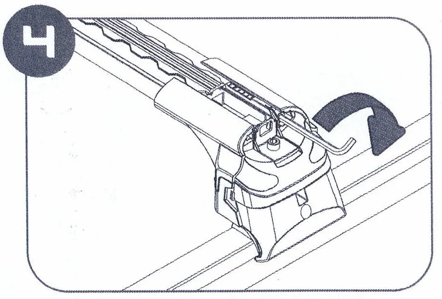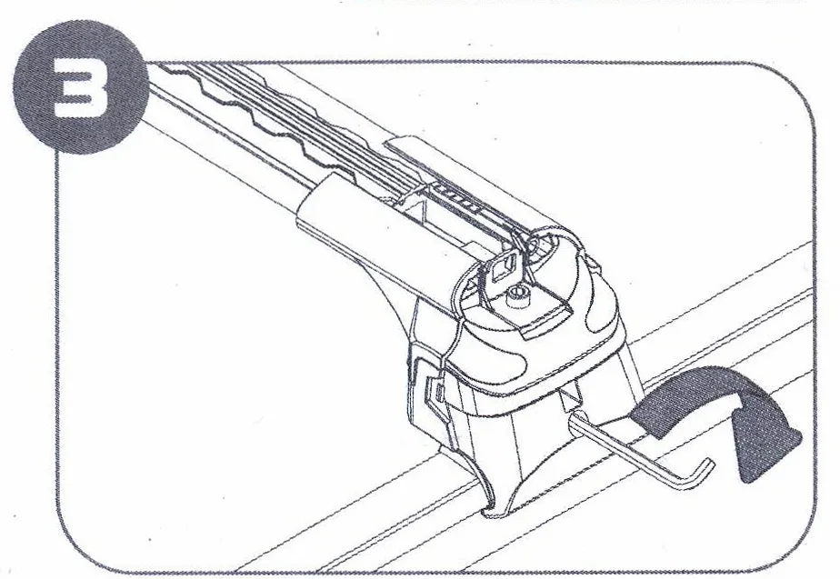 | Разместите собранные дуги в нужном месте рейлинга автомобиля. Используя шестигранный ключ, затяните зажим, чтобы закрепить опору на рейлингах. Внимание! Убедитесь, что каждая опора правильно установлена на рейлинге. | ![]() |