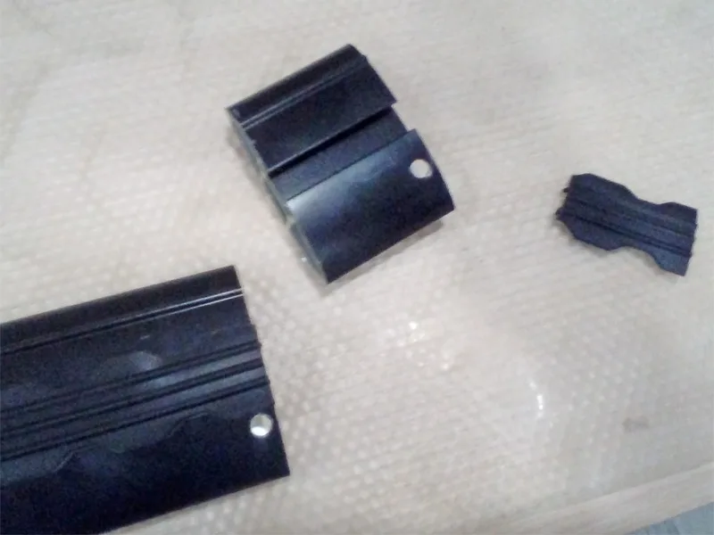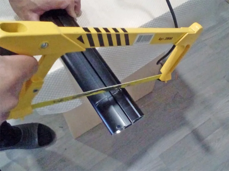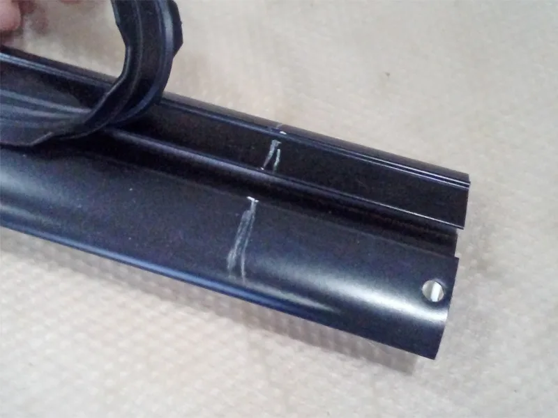 4. Корректировка длины. Итак, мы отметили линию на дуги, по которой будем резать профиль. Также стоит отогнуть или убрать на время верхний резиновый уплотнитель, чтобы он не мешался при резке и сверлении.