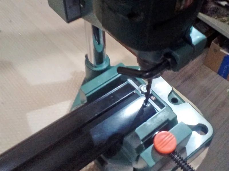 6. Сверление. На расстоянии до 3 мм от торца высверливаем отверстие (сверло на 6), аналогичное тому, которое было на отрезанном профиле дуги. Данное отверстие будет использовано как дополнительный стопор – под него в опоре есть специальный “язычок”.