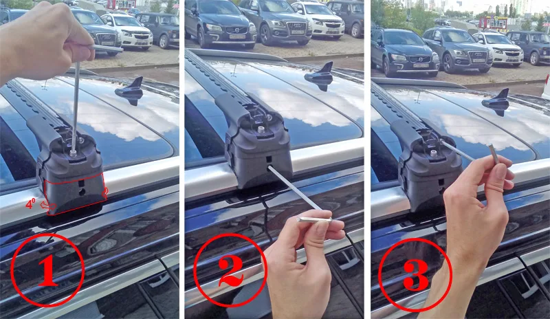 | Используя шестигранный ключ, затяните боковой регулировочный винт, чтобы зафиксировать опоры, после чего убедитесь, что нет движения по ширине автомобиля. | ![]() |